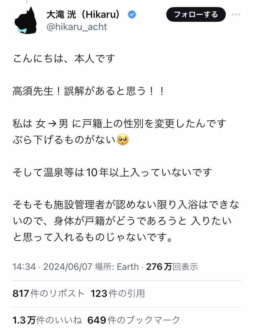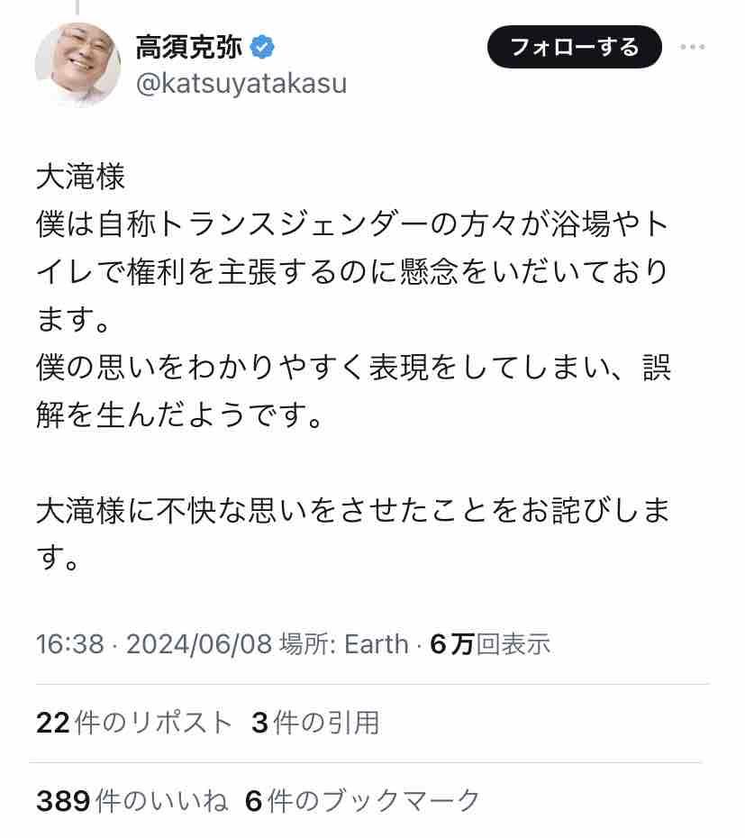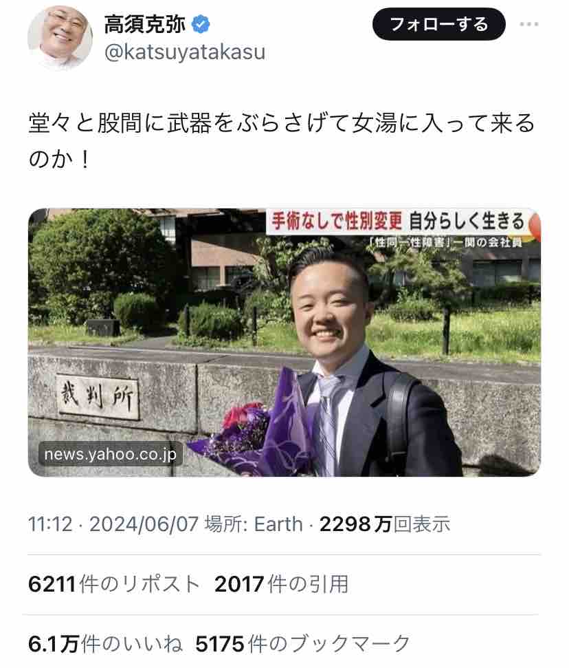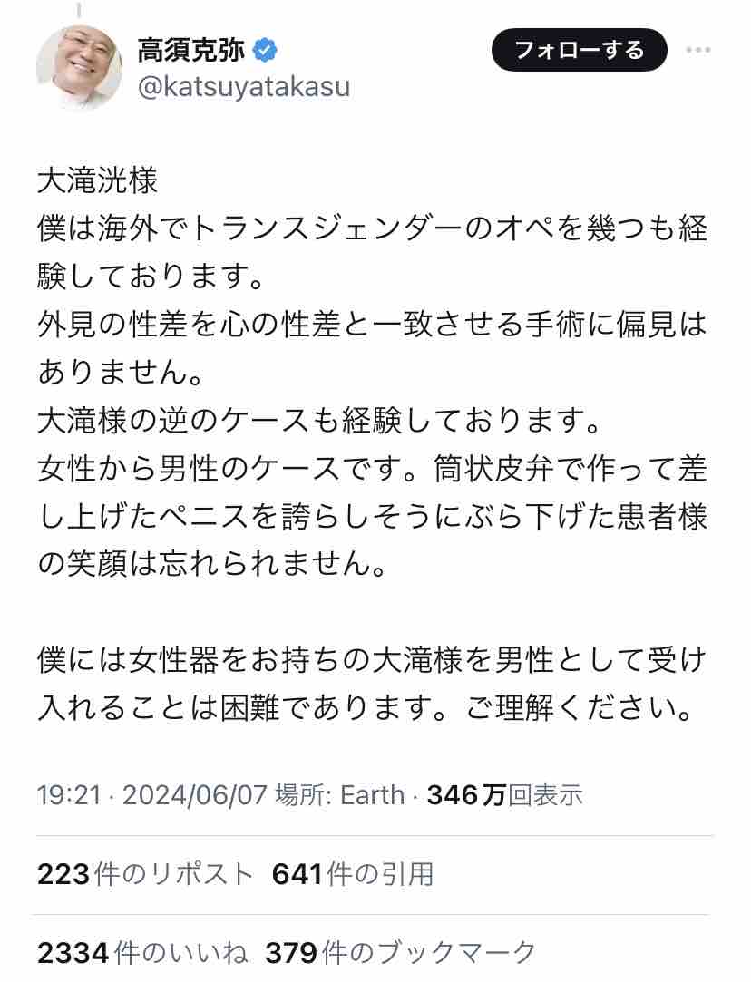 ほえ〜…FtMとかあまり分かってない素人さんならともかく、トランスジェンダーの手術経験もある医療の専門家である高須院長がこんなとんでもない誤解をしたとあっては、余計に問題なのでは…