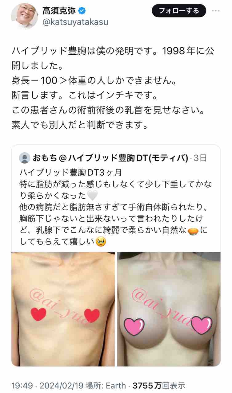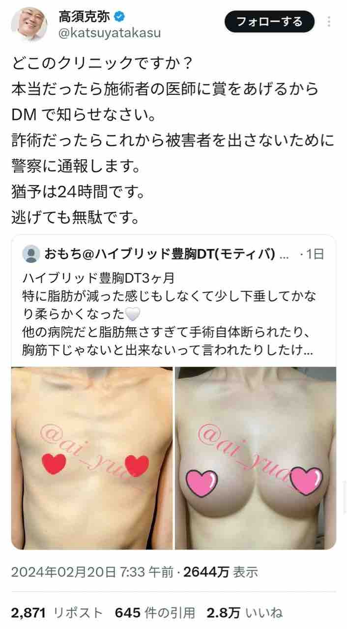 『【悲報】女「豊胸した」高須克弥「詐術か?警察に通報します。」→事実だったことが確定し炎上してしまう…』