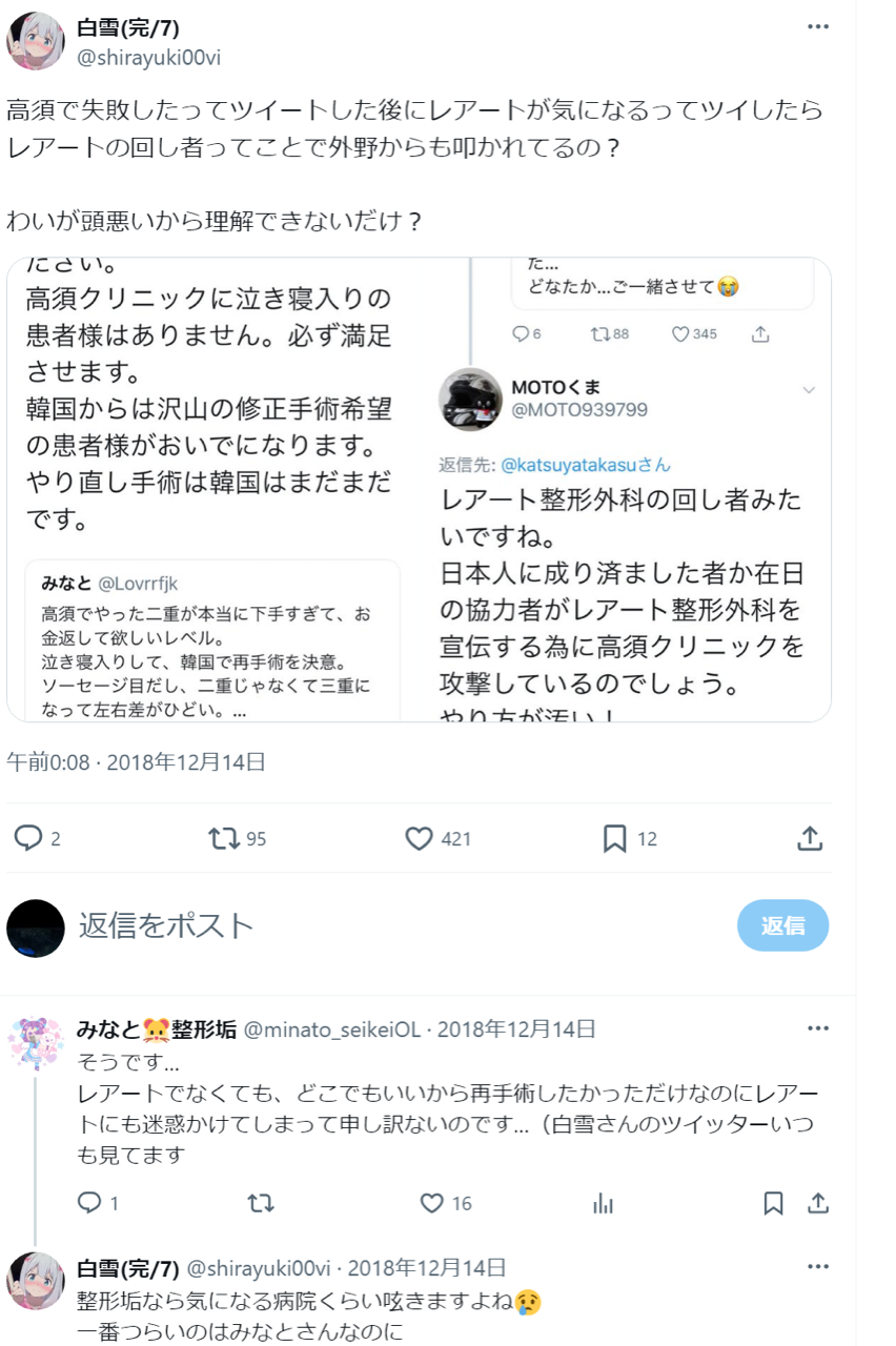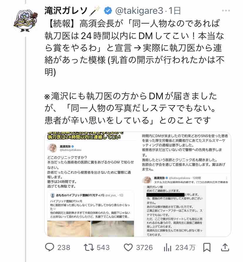 なお、この件について情報収集した時点で高須院長からは、誤解を認めたり謝罪する動きは見当たりません。