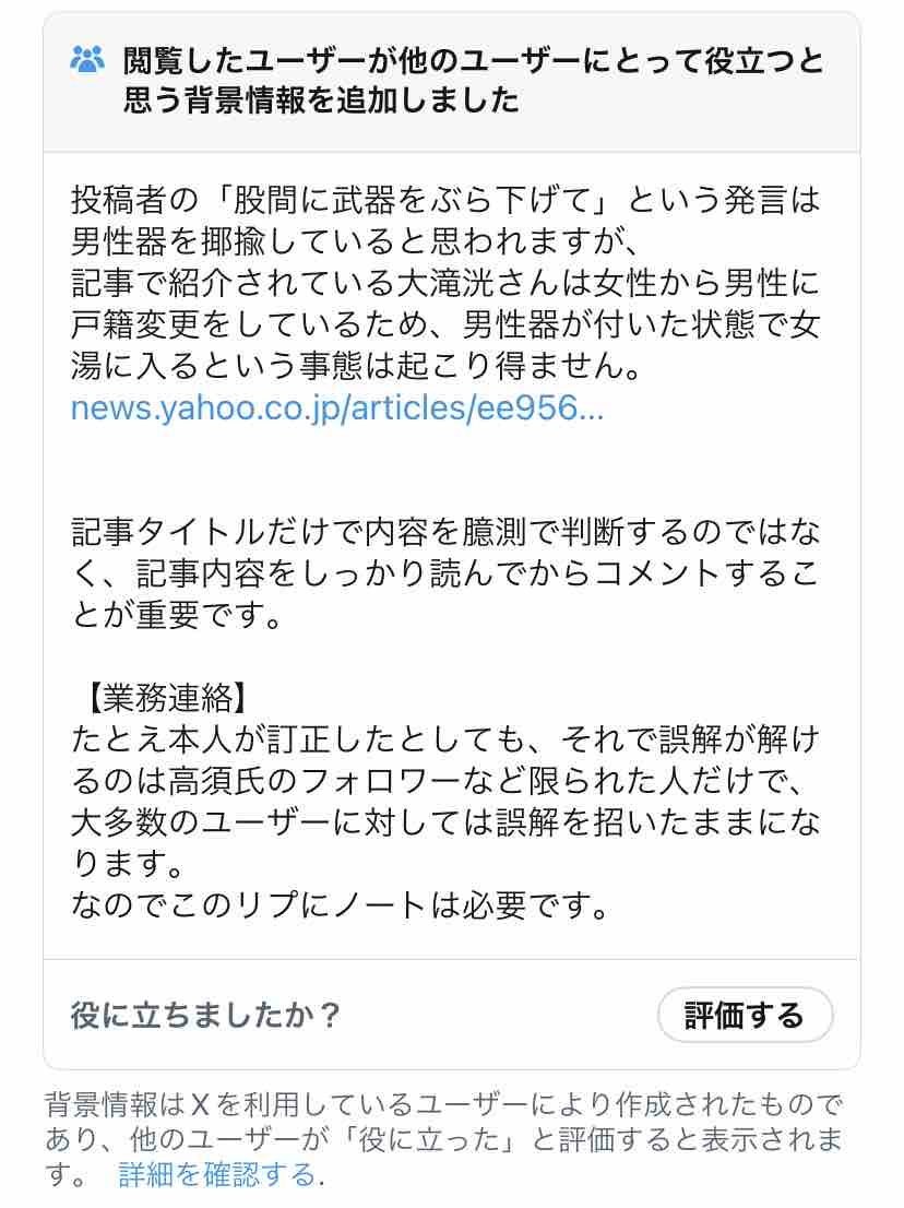 そして現在は表示されていない様ですが、高須院長のポストにはコミュニティノートが付けられていた模様。