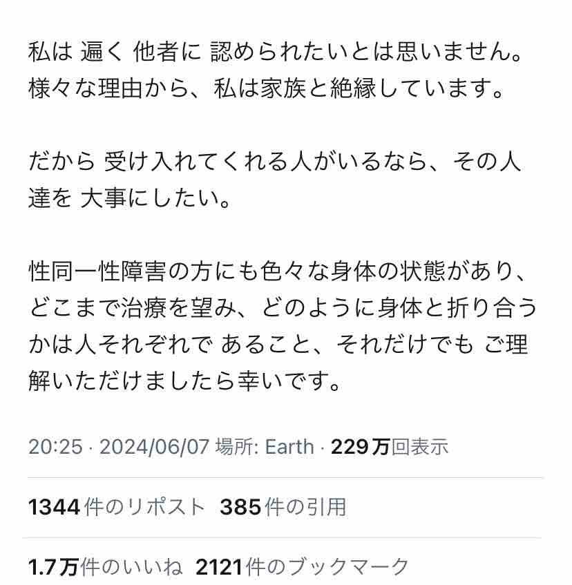 しかし、元記事を読むと件の人物は生殖能力をなくす手術なしで女性から男性へ戸籍を変更した方…